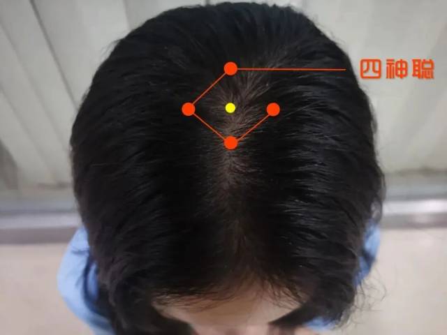 四神聪穴:位于百会穴前后左右各一寸,用拇指点按这四个穴位,可促进血液循环。